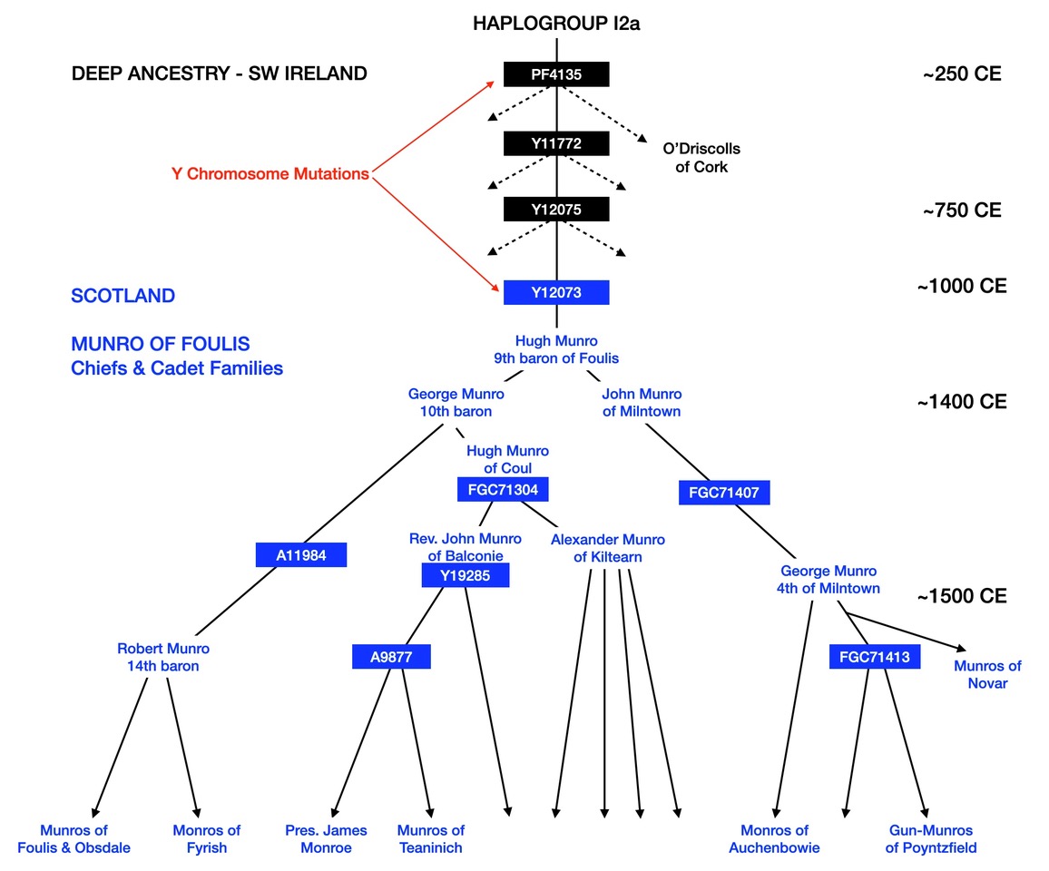 This Munro of Foulis male line is part of a branch or Haplogroup of the Y chromosome tree called I2a, which separated from other male lines in the Middle East about 20,000 years ago. Its bearers are now commonest in the Balkans, but some of this group made their way to the British Isles about 7000 years ago. At least 1750 years ago, a new mutation called PF4135 arose in a man whose male descendants are now most commonly found in Southwest Ireland. These include the large O’Driscoll family of West Cork, but the Munros of Foulis also carry PF4135 and so must have a common male ancestor with the O’Driscolls and other Irish families who bear it.